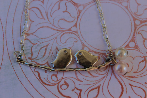 "Birds of a Feather," designed by The Posh Daisy, is beautiful and dainty and unique. it's a Mommy and a Daddy bird perched on the branch with two little baby bird egg pearls- one a faint pink and one white. i love my Birds of a Feather necklace. i tell people "if me and my family were birds, this would be us."